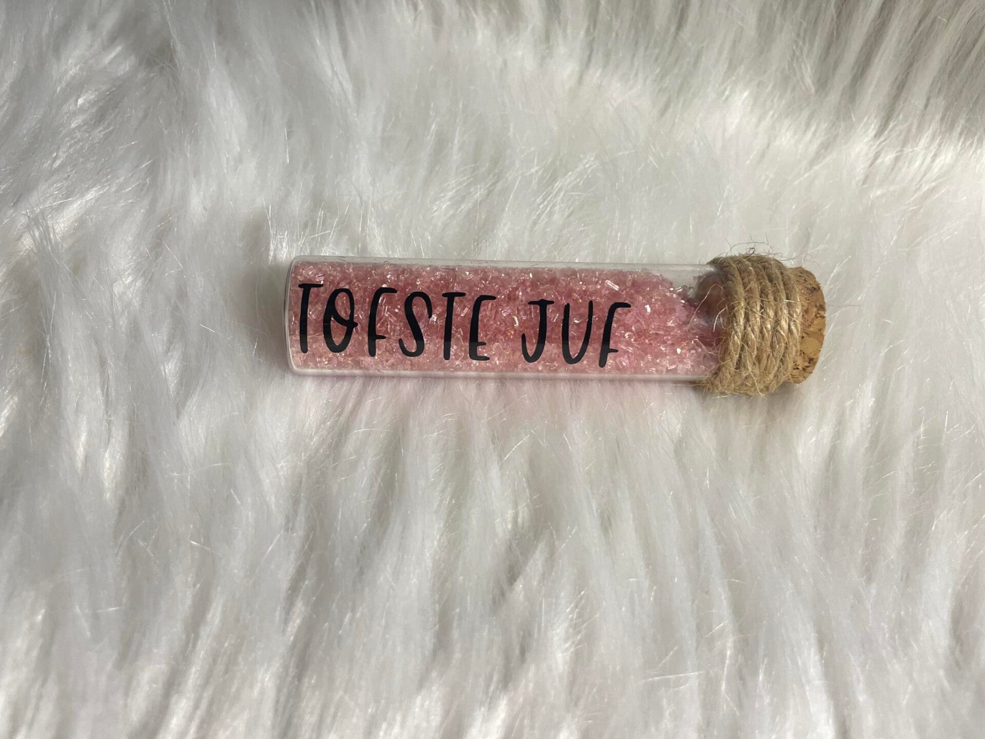 Glazen buisje met kurken dop deze zijn gevuld met badzout